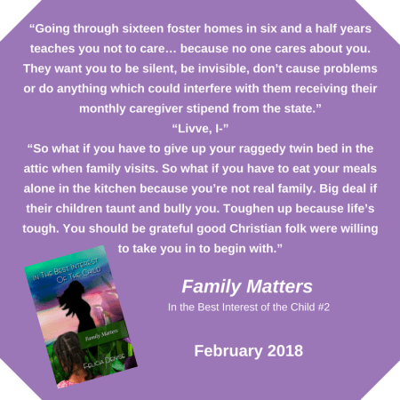 Currently working on several projects, Felicia plans to release book 2 of In the Best Interest of the Child โ Family Matters, in summer 2017.